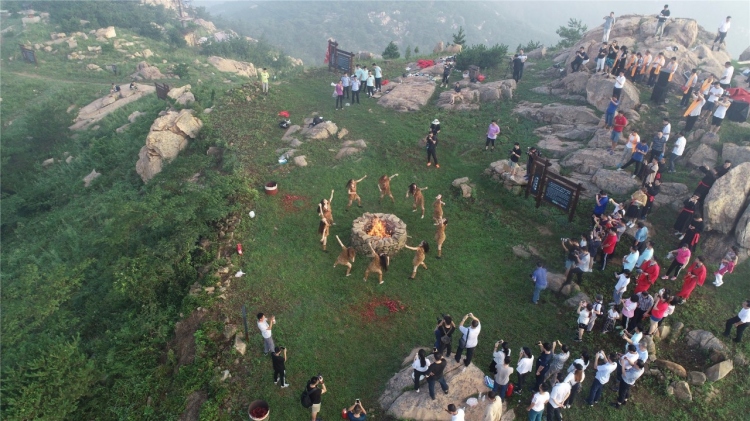 本次活動以“東方太陽城·山海祈福行”為主題,旨在繼承歷史傳統(tǒng),弘揚太陽文化,打造民俗文化旅游節(jié)慶品牌和日照城市旅游新名片?;顒又饕譃殪肴沾蟮洹⒒鸱N傳遞和太陽文化節(jié)開幕式三部分。 清晨5:38分,祀日大典在山清水秀、靈氣自生的人間仙境——— 天臺山主峰正式開始,此次祀日大典分敬獻貢品、恭讀祭文、頂禮膜拜、燔柴祀日、祀日樂舞、火種采集等9個環(huán)節(jié),全體賓客與典儀人員一起行“太陽禮”,集體祈福。