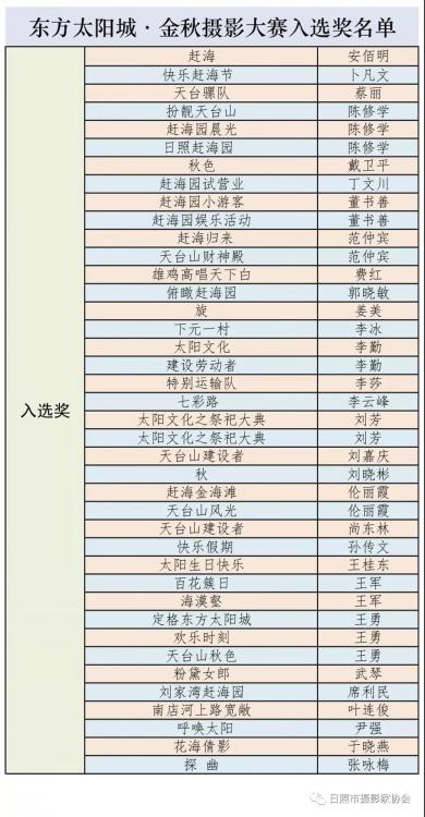 為更好的宣傳推介日照東方太陽城所承載著日照幾千年來源遠流長的太陽文化,為我市旅游經濟增添一顆璀璨明珠,給游客一個非來日照不可的理由,助推旅游富市戰(zhàn)略。由日照市文學藝術界聯合會、山東海洋文化旅游發(fā)展有限公司主辦、日照市攝影家協會、日照市藝術攝影學會承辦的“2018東方太陽城 金秋攝影大賽”于10月15日開始征稿,期間還組織了數次集中采風,征稿結束后,組委會邀請專家對參賽作品進行了認真細致的評選,共評選出一等獎1幅(組),二等獎3幅(組),三等獎6幅(組),佳作獎10幅(組)和入選獎40幅(組)。